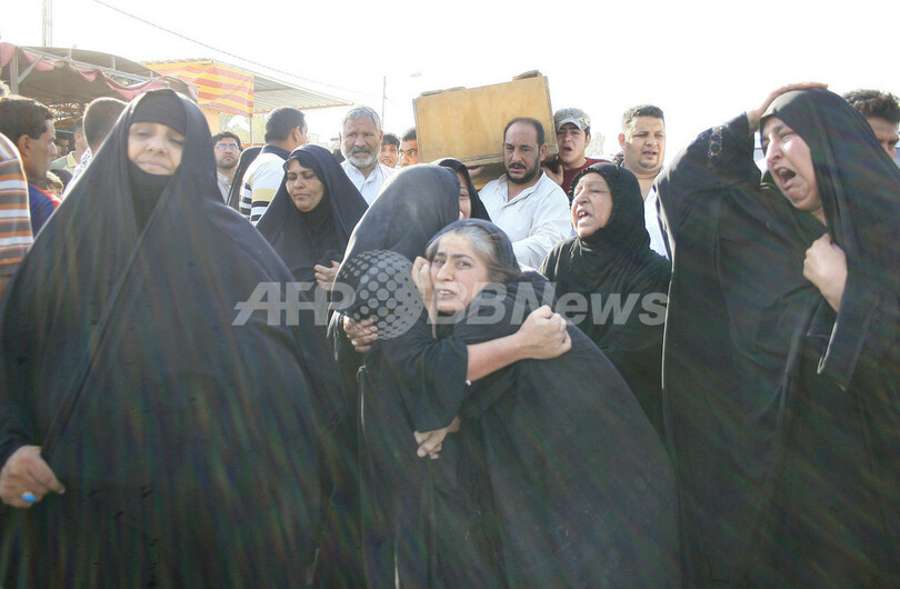 カジミヤ(Kadhimiyah)地区へ礼拝へ出かけようとしていたシーア派教徒によると、空爆で子ども3人と女性4人を含む11人が死亡、また少なくとも家屋1件、トラック1台が破壊されたという。(c)AFP/Khalil Jalil
