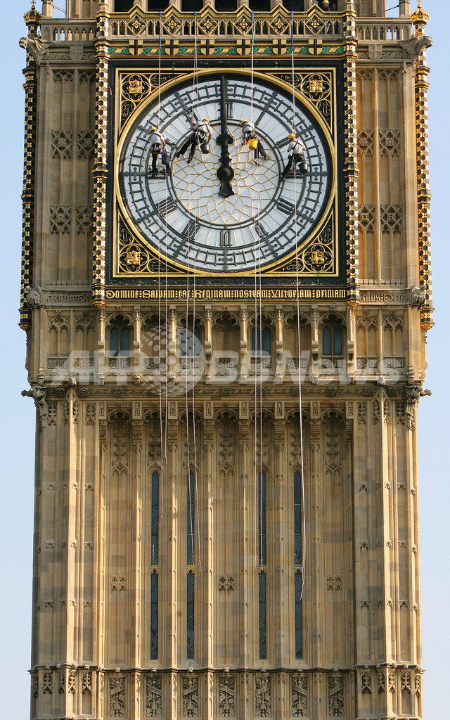午前8時(GMT午前7時)が告げられた後、あの「ボーン」という鐘の音は止められた。英国国会議議事堂(Westminster’s Houses of Parliament)に付属している全長96メートルの「ビッグベン」の南面を、数名のスタッフが針を正午の位置に合わせる為、垂直に降下した。