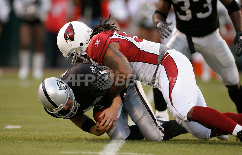 スポーツ アメリカンフットボール レイダース プレシーズン初戦を勝利で飾る 2007年8月12日 19:26 発信地:オークランド/米国 [ 北米 米国 ] このニュースをシェア ‹ › ❮ 6/9 ❯ レイダースのQBジョシュ・マッカウン(%%Josh McCown%%、左)にサックを決めるカーディナルスのDEダーネル・ドケット(%%Darnell Dockett%%)。(c)AFP/Getty Images Greg Trott 画像作成中 ! 【8月12日 AFP】07NFL・プレシーズン・第1週、オークランド・レイダーズ(Oakland Raiders)vsアリゾナ・カーディナルス(Arizona Cardinals)。試合は27-23でレイダースが勝利した。(c)AFP/Getty Images アメリカンフットボール 一覧へ> メディア・報道関係・法人の方向け 写真・動画 購入のお問合せ>