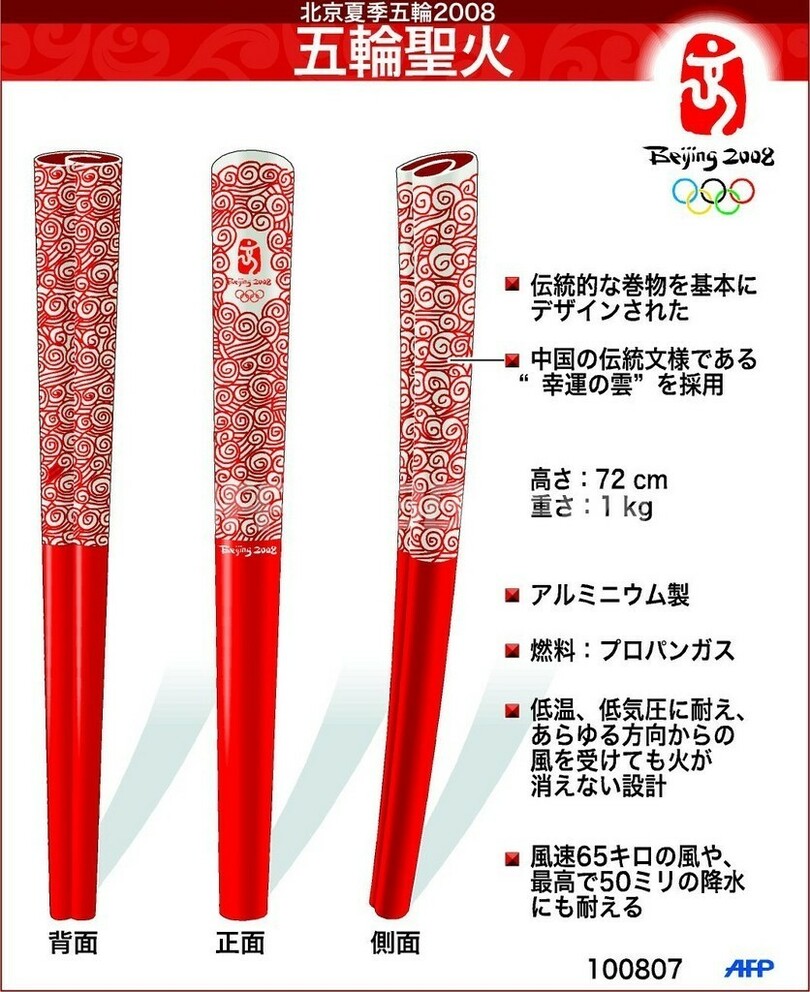 スポーツ スポーツ その他 図解 2008年北京夏季五輪、聖火リレー・トーチのデザイン 2007年8月14日 9:13 発信地:北京/中国 [ 中国・台湾 中国 ] このニュースをシェア 図は、2008年北京夏季五輪の聖火を示したもの。(c)AFP 【8月14日 AFP】アルミニウム製のこの聖火は、中国の伝統的な巻物をもとにデザインされた。(c)AFP<ニュース解説画像一覧へ> スポーツ その他 一覧へ> メディア・報道関係・法人の方向け 写真・動画 購入のお問合せ>