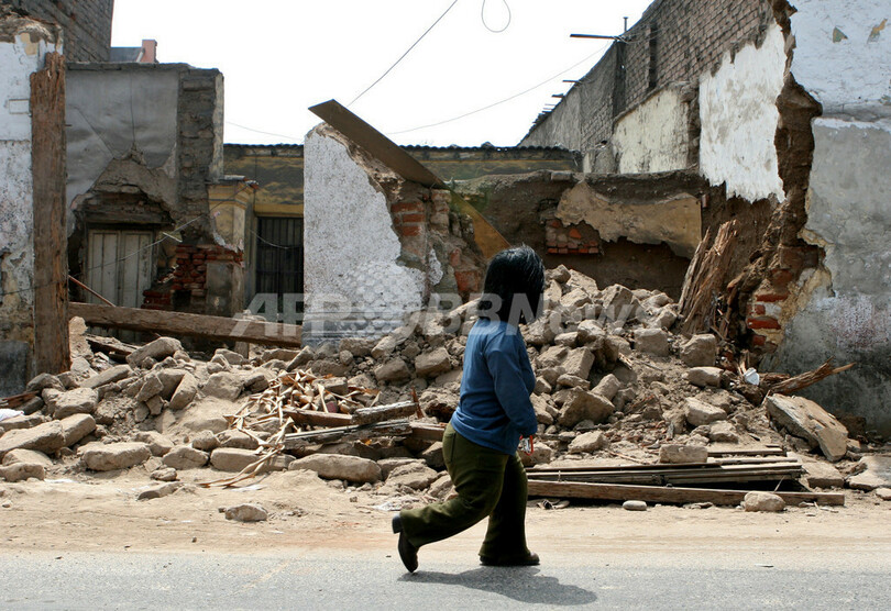 15日にペルー南部の沿岸で発生した地震の規模はマグニチュード8.0で、約500人が死亡、数百人が負傷した。現在も、がれきの下に生き埋めになっている人が多数いるものとみられている。(c)AFP
