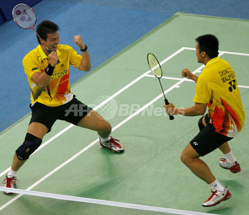 【8月17日 AFP】07バドミントン世界選手権(07 Badminton World Championships)・男子ダブルス準々決勝。マレーシアのチョン・タン・フック(Choong Tan Fook)/リー・ワン・ワー(Lee Wan Wah)組は、中国のフ・ハイファン(Fu Haifeng)/カイ・ユン(Cai Yun)組と対戦。フック/ワー組はセットカウント2-1(15-21、21-18、21-19)でフ・ハイファン/カイ・ユン組を破り、準決勝進出を決めた。(c)AFP