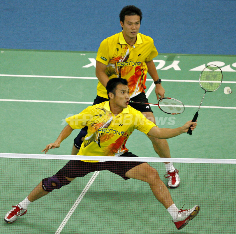 【8月17日 AFP】07バドミントン世界選手権(07 Badminton World Championships)・男子ダブルス準々決勝。マレーシアのチョン・タン・フック(Choong Tan Fook)/リー・ワン・ワー(Lee Wan Wah)組は、中国のフ・ハイファン(Fu Haifeng)/カイ・ユン(Cai Yun)組と対戦。フック/ワー組はセットカウント2-1(15-21、21-18、21-19)でフ・ハイファン/カイ・ユン組を破り、準決勝進出を決めた。(c)AFP