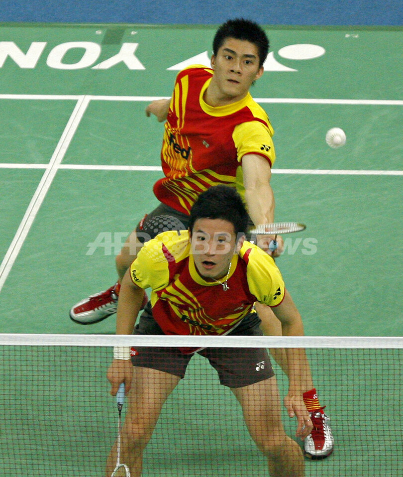 【8月17日 AFP】07バドミントン世界選手権(07 Badminton World Championships)・男子ダブルス準々決勝。マレーシアのチョン・タン・フック(Choong Tan Fook)/リー・ワン・ワー(Lee Wan Wah)組は、中国のフ・ハイファン(Fu Haifeng)/カイ・ユン(Cai Yun)組と対戦。フック/ワー組はセットカウント2-1(15-21、21-18、21-19)でフ・ハイファン/カイ・ユン組を破り、準決勝進出を決めた。(c)AFP