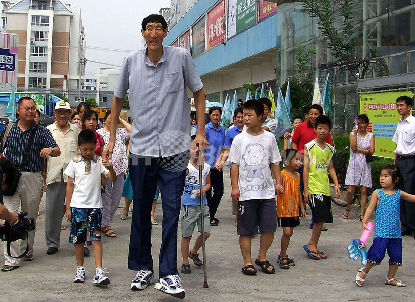 【8月18日 AFP】「生存する世界で最も身長が高い男性」として「ギネス世界記録(Guinness World Records)」に認定されている中国人男性、鮑喜順(Bao Xishun)さん。数十年に及ぶ念願の花嫁捜しに成功し、7月、中国の内モンゴル自治区(Inner Mongolia)の草原で、夏淑娟(Xia Shujun)さんと伝統的な結婚式を挙げた。鮑さんの身長は2メートル36センチ。一方、夫人の夏さんの身長は1メートル68センチで、鮑さんひじの高さほどしかない。内モンゴルで牧畜を営む一般人だった鮑さんだが、今では全国どこに行ってもすっかり有名人となった。(c)AFP