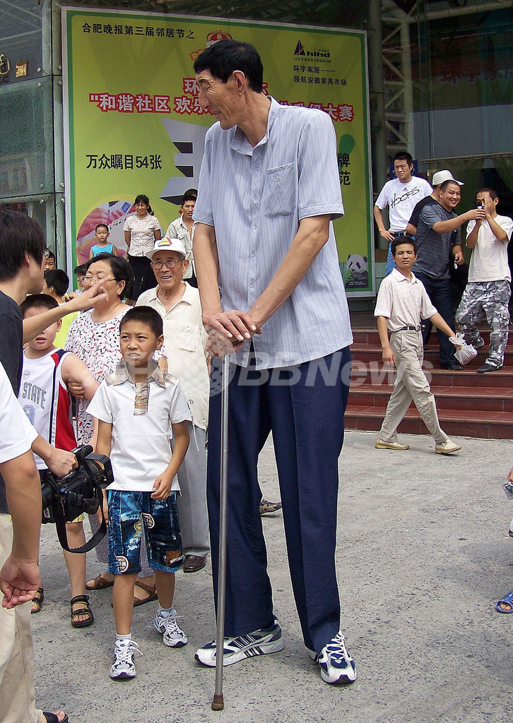 【8月18日 AFP】「生存する世界で最も身長が高い男性」として「ギネス世界記録(Guinness World Records)」に認定されている中国人男性、鮑喜順(Bao Xishun)さん。数十年に及ぶ念願の花嫁捜しに成功し、7月、中国の内モンゴル自治区(Inner Mongolia)の草原で、夏淑娟(Xia Shujun)さんと伝統的な結婚式を挙げた。鮑さんの身長は2メートル36センチ。一方、夫人の夏さんの身長は1メートル68センチで、鮑さんひじの高さほどしかない。内モンゴルで牧畜を営む一般人だった鮑さんだが、今では全国どこに行ってもすっかり有名人となった。(c)AFP