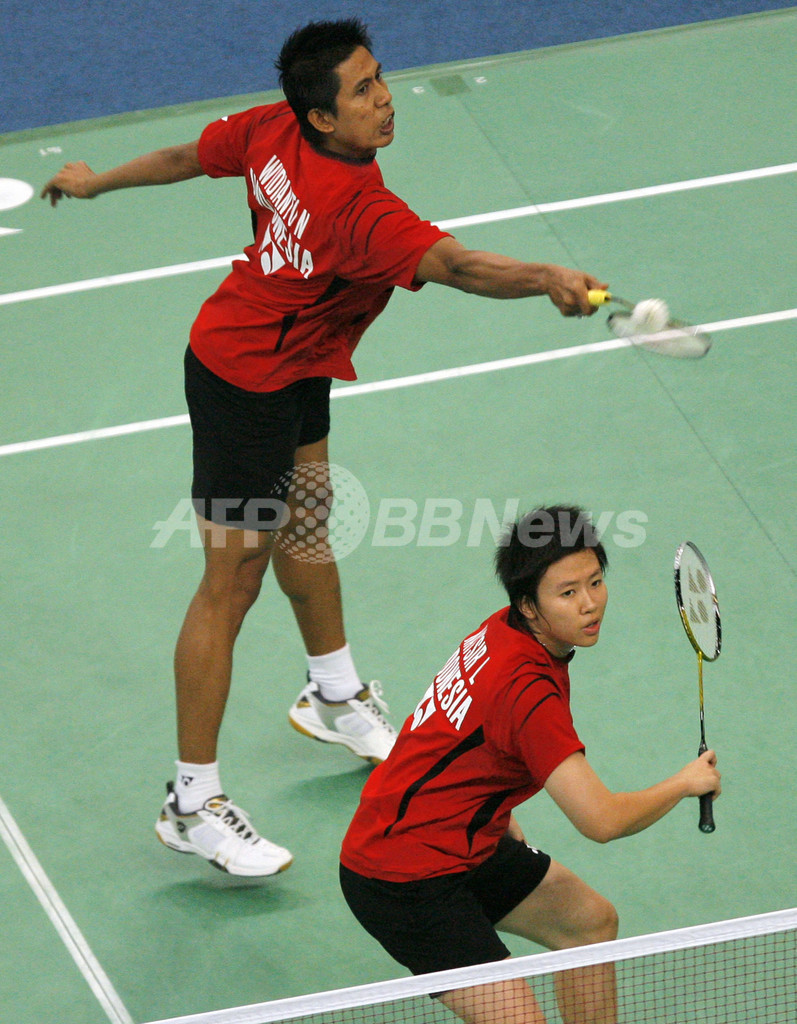 【8月18日 AFP】07バドミントン世界選手権(07 Badminton World Championships)・混合ダブルス準決勝。大会第2シードのノヴァ・ウィディアント(Nova Widianto、インドネシア)/リリヤナ・ナシル(Liliyana Natsir、インドネシア)組は、シェー・ツォンボー(Xie Zhongbo、中国)/チャン・ジェウェン(Zhang Yawen、中国)組と対戦。ウィディアント/ナシル組は2-1(21-15、15-21、22-20)でシェー・ツォンボー/チャン・ジェウェン組を降し、決勝進出を決めた。(c)AFP