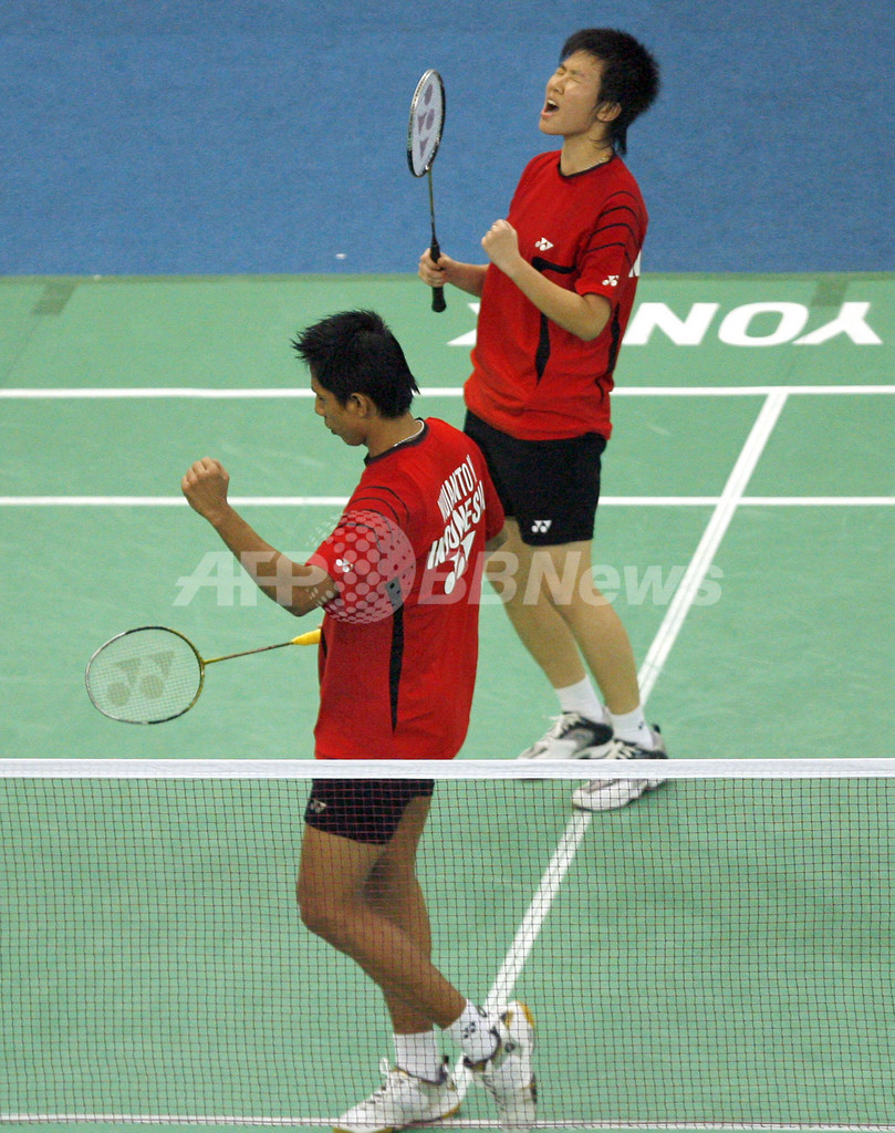 【8月18日 AFP】07バドミントン世界選手権(07 Badminton World Championships)・混合ダブルス準決勝。大会第2シードのノヴァ・ウィディアント(Nova Widianto、インドネシア)/リリヤナ・ナシル(Liliyana Natsir、インドネシア)組は、シェー・ツォンボー(Xie Zhongbo、中国)/チャン・ジェウェン(Zhang Yawen、中国)組と対戦。ウィディアント/ナシル組は2-1(21-15、15-21、22-20)でシェー・ツォンボー/チャン・ジェウェン組を降し、決勝進出を決めた。(c)AFP