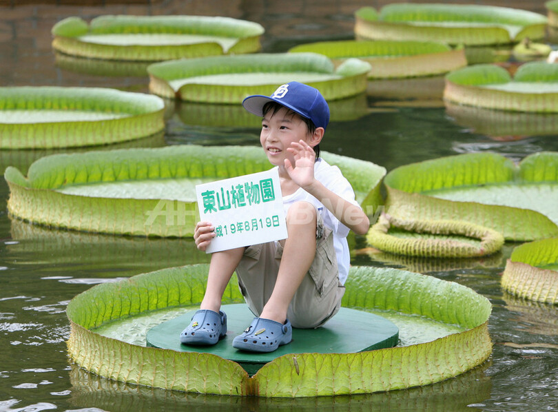 【8月20日 AFP】愛知県名古屋市にある東山動植物園(igashiyama Zoo and Botanical Garden)で19日、水に浮かぶ世界最大級の水生植物、パラグアイオニバス(Victoria Cruziana)に乗る体験ができる子供向けイベントが開催された。