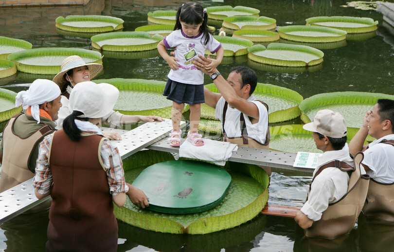 【8月20日 AFP】愛知県名古屋市にある東山動植物園(igashiyama Zoo and Botanical Garden)で19日、水に浮かぶ世界最大級の水生植物、パラグアイオニバス(Victoria Cruziana)に乗る体験ができる子供向けイベントが開催された。