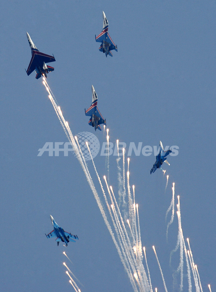 モスクワの南東、ジュコフスキー(Zhukovsky)訓練センターで行われたこの航空見本市では、プーチン大統領はロシア空軍総司令官や閣僚、ウクライナのビクトル・ユーシェンコ(Viktor Yanukovych)大統領などの外国使節を率いて、スホーイ(Sukhoi)やミグ(MiG)、ツポレフ(Tupolev)などの航空機製造会社の航空機を観覧した。