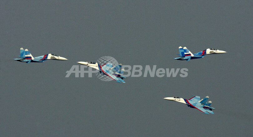 モスクワの南東、ジュコフスキー(Zhukovsky)訓練センターで行われたこの航空見本市では、プーチン大統領はロシア空軍総司令官や閣僚、ウクライナのビクトル・ユーシェンコ(Viktor Yanukovych)大統領などの外国使節を率いて、スホーイ(Sukhoi)やミグ(MiG)、ツポレフ(Tupolev)などの航空機製造会社の航空機を観覧した。