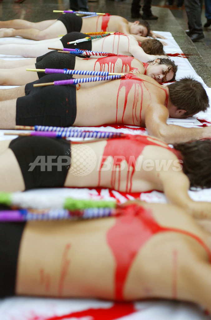 ニュース ライフ こぼれ話 動物保護団体「Equanimal」 反闘牛パフォーマンスを行う 2007年8月24日 10:01 発信地:ビルバオ/スペイン [ ヨーロッパ スペイン ] このニュースをシェア ‹ › ❮ 3/8 ❯ 2007年8月23日、スペイン北部ビルバオ(Bilbao)で行われた動物保護団体「Equanimal」による反闘牛パフォーマンス。(c)AFP/RAFA RIVAS 画像作成中 ! 【8月24日 AFP】スペイン北部ビルバオ(Bilbao)で23日、動物保護団体「Equanimal」による反闘牛パフォーマンスが行われた。スペインのテレビ局TVEは22日、児童視聴者の保護のため、半世紀に渡り続いた伝統の闘牛の生放送を中止することを決定した。(c)AFP ライフ 一覧へ> メディア・報道関係・法人の方向け 写真・動画 購入のお問合せ>