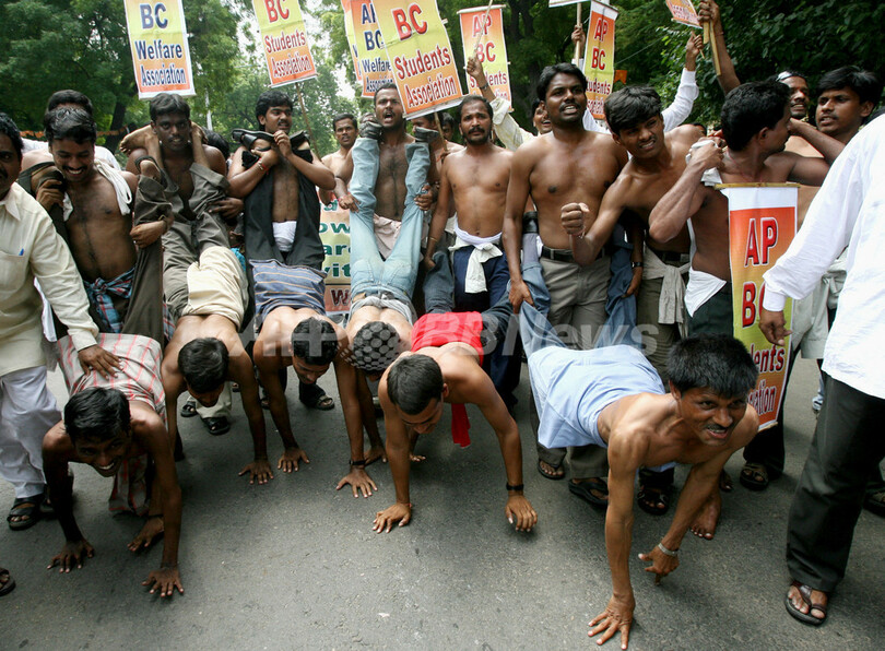 ニュース ライフ インドの大学生が上半身裸で抗議活動、雇用機会拡大など求め 2007年8月24日 16:54 発信地:ニューデリー/インド [ アジア・オセアニア インド ] このニュースをシェア 2007年8月23日、ニューデリー(New Delhi)で抗議活動を行うアンドラ・プラデシュ(Andhra Pradesh)州の学生たち。(c)AFP/RAVEENDRAN 【8月24日 AFP】南部アンドラプラデシュ(Andhra Pradesh)州の学生らが23日、ニューデリー(New Delhi)で、教育設備の充実と卒業後の雇用機会の拡大を求め、上半身裸で抗議活動を行った。(c)AFP ライフ 一覧へ> メディア・報道関係・法人の方向け 写真・動画 購入のお問合せ>