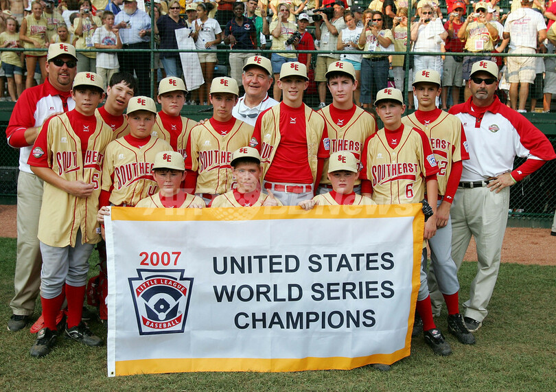 【8月26日 AFP】2007年リトルリーグ・ワールドシリーズ(2007 Little League World Series)・米国の部・決勝、ラボック・ウエスタンLL(Lubbock Western LL、テキサス州)vsワーナーロビンズ・アメリカンLL(Warner Robins American LL、ジョージア州)。試合はワーナーロビンズが5-2でラボックを降し、現地時間26日にリトルリーグ世界一をかけて国際の部で優勝した日本の東京北砂LL(Tokyo Kitasuna LL)と対戦する。(c)AFP/Getty Images