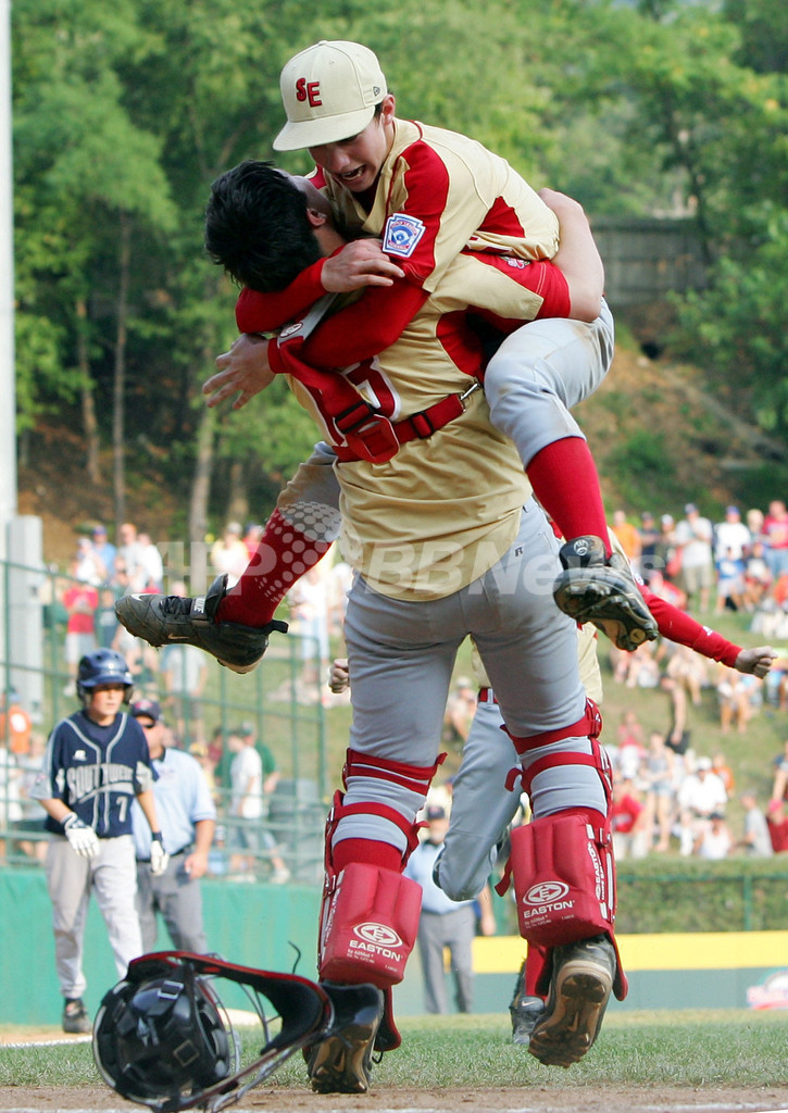 【8月26日 AFP】2007年リトルリーグ・ワールドシリーズ(2007 Little League World Series)・米国の部・決勝、ラボック・ウエスタンLL(Lubbock Western LL、テキサス州)vsワーナーロビンズ・アメリカンLL(Warner Robins American LL、ジョージア州)。試合はワーナーロビンズが5-2でラボックを降し、現地時間26日にリトルリーグ世界一をかけて国際の部で優勝した日本の東京北砂LL(Tokyo Kitasuna LL)と対戦する。(c)AFP/Getty Images