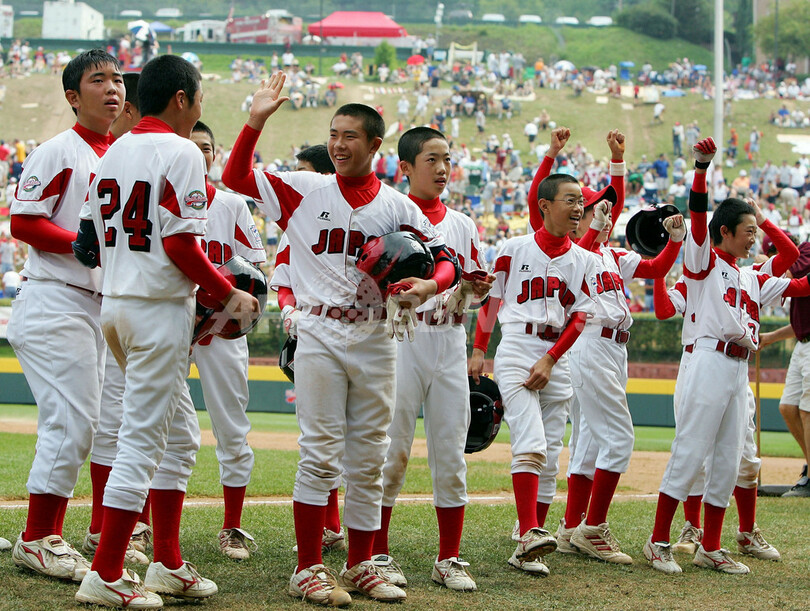 【8月26日 AFP】2007年リトルリーグ・ワールドシリーズ(2007 Little League World Series)・国際の部・決勝、Pabao LL(カリブ海代表)vs東京北砂LL(Tokyo Kitasuna LL、日本)。試合はサヨナラで東京北砂LLが7-4でPabao LLに勝利し、現地時間26日にリトルリーグ世界一をかけて米国の部で優勝したラボック・ウエスタンLL(Lubbock Western LL、テキサス州)と対戦する。(c)AFP/Getty Images