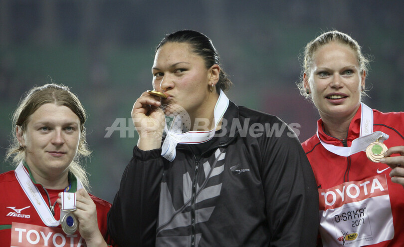 【8月26日 AFP】第11回世界陸上大阪大会(11th IAAF World Championships in Athletics Osaka)。女子砲丸投げの表彰式が行われ、20メートル54を記録して優勝を果たしたニュージーランドのバレリー・ビリ(Valerie Vili)に金メダルが授与された。またベラルーシのナデジダ・オスタプチュク(Nadzeya Ostapchuk)に銀メダル、ドイツのナディネ・クライナート(Nadine Kleinert)に銅メダルが授与された。(c)AFP