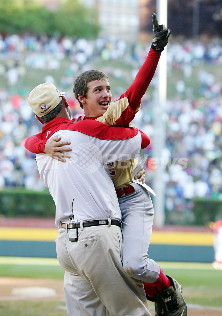 【8月27日 AFP】2007年リトルリーグ・ワールドシリーズ(2007 Little League World Series)・優勝決定戦。ワーナーロビンズ・アメリカンLL(Warner Robins American LL、ジョージア州)vs東京北砂LL(Tokyo Kitasuna LL、日本)。試合はワーナーロビンズが延長8回3-2で東京北砂にサヨナラ勝ちを収め、ワーナーロビンズはリトルリーグ世界一に輝いた。(c)AFP/Getty Images