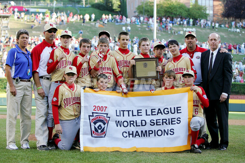 【8月27日 AFP】2007年リトルリーグ・ワールドシリーズ(2007 Little League World Series)・優勝決定戦。ワーナーロビンズ・アメリカンLL(Warner Robins American LL、ジョージア州)vs東京北砂LL(Tokyo Kitasuna LL、日本)。試合はワーナーロビンズが延長8回3-2で東京北砂にサヨナラ勝ちを収め、ワーナーロビンズはリトルリーグ世界一に輝いた。(c)AFP/Getty Images