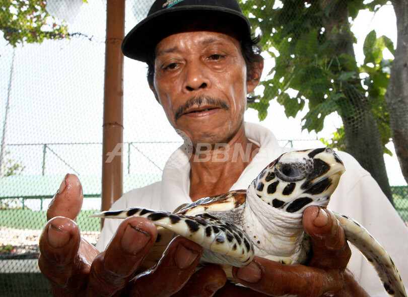 環境保護への取り組みに対しインドネシア大統領から表彰されたこともあるサリムさんは、1993年に甲羅がでこぼこに変形したタイマイを3匹発見したという。そのうちたった1匹生き残ったマイタイを抱きながら、「こんな現象は以前には見られなかったことだ」とサリムさんは憂慮する。これが異変への警鐘の始まりだった。以後、事態は悪化の一途をたどるばかりだ。(c)AFP