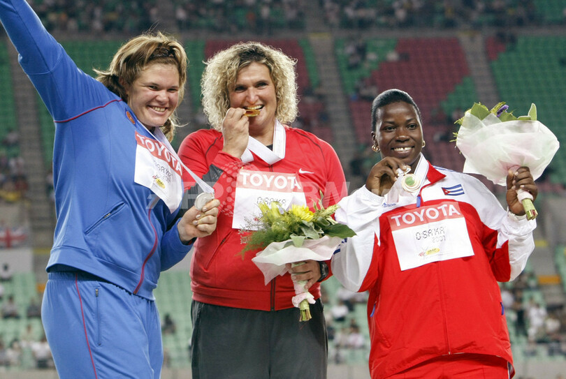 【8月29日 AFP】第11回世界陸上大阪大会(11th IAAF World Championships in Athletics Osaka)、女子円盤投げ・決勝。66メートル61を記録し優勝を果たしたドイツのフランカ・ディーチェ(Franka Dietzsch)は、2位に入ったロシアのダリャ・ピスチャルニコワ(Darya Pishchalnikova)、3位に入ったキューバのヤレリス・バリオス(Yarelis Barrios)と共に表彰式に臨み、メダルを授与された。(c)AFP