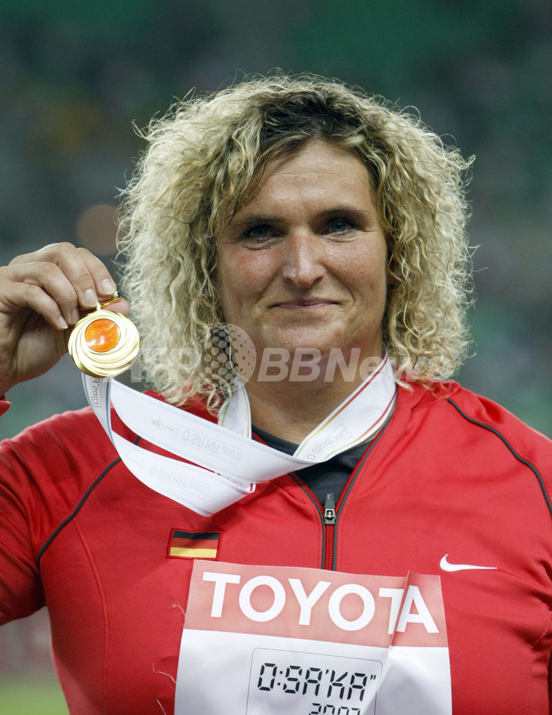 【8月29日 AFP】第11回世界陸上大阪大会(11th IAAF World Championships in Athletics Osaka)、女子円盤投げ・決勝。66メートル61を記録し優勝を果たしたドイツのフランカ・ディーチェ(Franka Dietzsch)は、2位に入ったロシアのダリャ・ピスチャルニコワ(Darya Pishchalnikova)、3位に入ったキューバのヤレリス・バリオス(Yarelis Barrios)と共に表彰式に臨み、メダルを授与された。(c)AFP