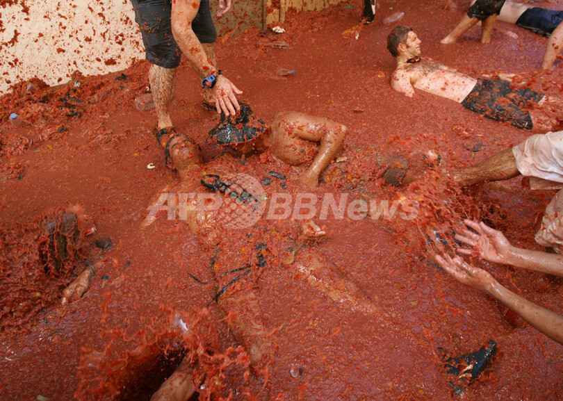 ニュース ライフ スペインで恒例のトマト祭り「トマティーナ」開催 2007年8月30日 14:58 発信地:ブニョール/スペイン [ ヨーロッパ スペイン ] このニュースをシェア ‹ › ❮ 2/11 ❯ 2007年8月29日、スペインのブニョール(Bunol)で開催されたトマト祭り(Tomatina)でトマトの海に沈む参加者。(c)AFP/PHILIPPE DESMAZES 画像作成中 ! 【8月29日 AFP】(写真追加)参加者が互いにトマトを投げ合うスペインで毎年恒例の祭り「トマティーナ(Tomatina)」が29日、地中海沿岸のバレンシア西方約40キロの町ブニョール(Bunol)で開催された。祭りに使用されるトマトは数十万キロ。全身トマトまみれの「人間ガスパチョ (スペイン風冷製トマトスープ)」になるために、今年は4万人が集まった。世界で最も汚れる祭りとも言われている。(c)AFP ライフ 一覧へ> メディア・報道関係・法人の方向け 写真・動画 購入のお問合せ>