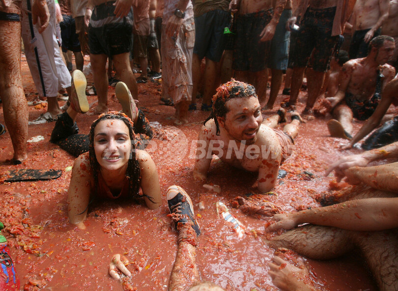ニュース ライフ スペインで恒例のトマト祭り「トマティーナ」開催 2007年8月30日 14:58 発信地:ブニョール/スペイン [ ヨーロッパ スペイン ] このニュースをシェア ‹ › ❮ 11/11 ❯ 2007年8月29日、スペインのブニョール(Bunol)で開催されたトマト祭り(Tomatina)でトマトの海に沈む参加者。(c)AFP/PHILIPPE DESMAZES 画像作成中 ! 【8月29日 AFP】(写真追加)参加者が互いにトマトを投げ合うスペインで毎年恒例の祭り「トマティーナ(Tomatina)」が29日、地中海沿岸のバレンシア西方約40キロの町ブニョール(Bunol)で開催された。祭りに使用されるトマトは数十万キロ。全身トマトまみれの「人間ガスパチョ (スペイン風冷製トマトスープ)」になるために、今年は4万人が集まった。世界で最も汚れる祭りとも言われている。(c)AFP ライフ 一覧へ> メディア・報道関係・法人の方向け 写真・動画 購入のお問合せ>