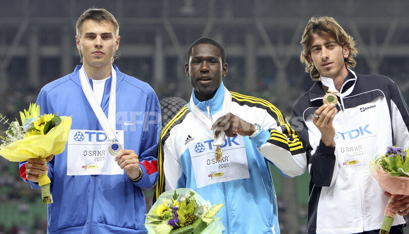 【8月30日 AFP】第11回世界陸上大阪大会(11th IAAF World Championships in Athletics Osaka)、男子走り高跳び・メダル授与式。バハマのドナルド・トーマス(Donald Thomas)は、2メートル35を1回目でクリアし、金メダルを獲得した。また、2位のヤロスラフ・ルイバコフ(Yaroslav Rybakov、ロシア)は銀メダル、3位のキリアコス・イオアヌ(Kyriakos Ioannou、キプロス)が銅メダルを獲得した。(c)AFP