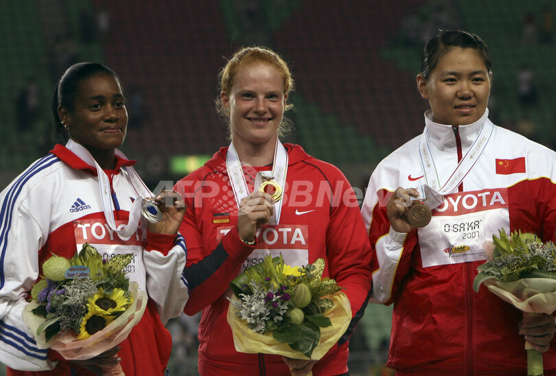 【8月30日 AFP】第11回世界陸上大阪大会(11th IAAF World Championships in Athletics Osaka)、女子ハンマー投げ・決勝。74メートル76で優勝したドイツのベッティー・ヘイドラー(Betty Heidler)は、74メートル74を記録して2位に入ったイプシ・モレノ(Yipsi Moreno、キューバ)、74メートル39を記録して3位に入ったチョウ・ブンシュウ(Zhang Wenxiu、中国)と共に表彰式に臨み、メダルを授与された。(c)AFP