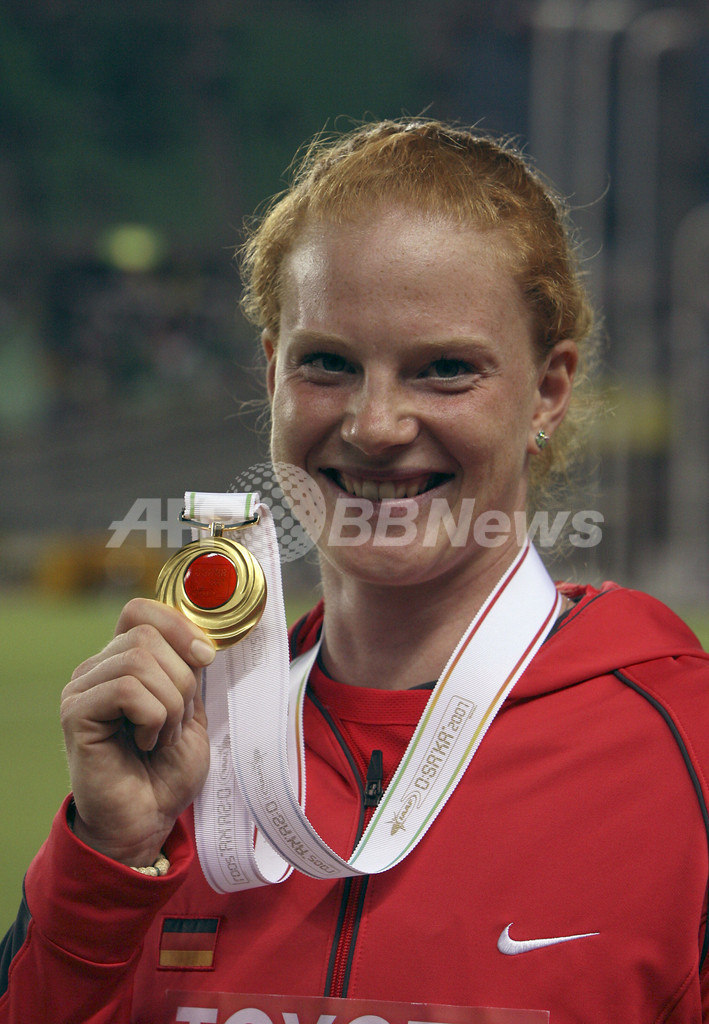 【8月30日 AFP】第11回世界陸上大阪大会(11th IAAF World Championships in Athletics Osaka)、女子ハンマー投げ・決勝。74メートル76で優勝したドイツのベッティー・ヘイドラー(Betty Heidler)は、74メートル74を記録して2位に入ったイプシ・モレノ(Yipsi Moreno、キューバ)、74メートル39を記録して3位に入ったチョウ・ブンシュウ(Zhang Wenxiu、中国)と共に表彰式に臨み、メダルを授与された。(c)AFP
