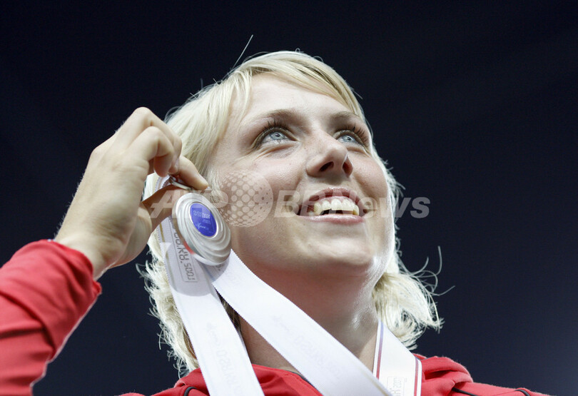 【9月1日 AFP】第11回世界陸上大阪大会(11th IAAF World Championships in Athletics Osaka)、女子やり投げ・メダル授与式。チェコのバルボラ・スポタコバ(Barbora Spotakova)は、67メートル07を記録し、金メダルを獲得した。また、2位のクリスティーナ・オーバークフォル(Christina Obergfoll、ドイツ)が銀メダル、3位のシュテフィ・ネリウス(Steffi Nerius、ドイツ)が銅メダルを獲得した。(c)AFP