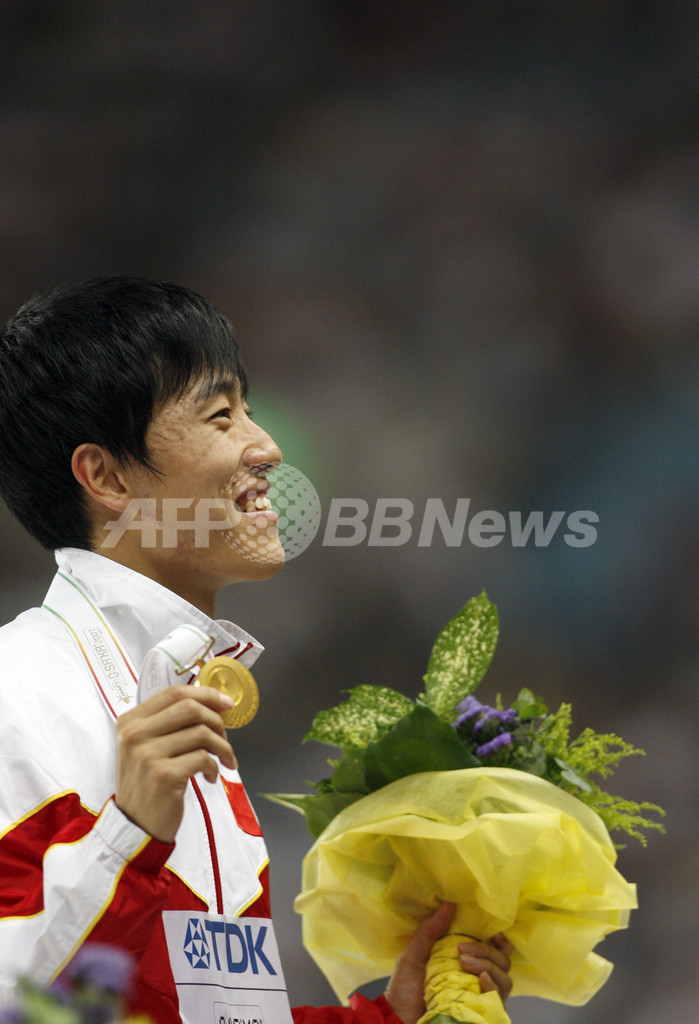 【9月1日 AFP】第11回世界陸上大阪大会(11th IAAF World Championships in Athletics Osaka)、男子110メートルハードル・メダル授与式。中国の劉翔(Liu Xiang)は、12秒95を記録し、金メダルを獲得した。また、2位のテレンス・トラメル(Terrence Trammell、米国)が銀メダル、3位のデービッド・ペイン(David Payne、米国)が銅メダルを獲得した。(c)AFP