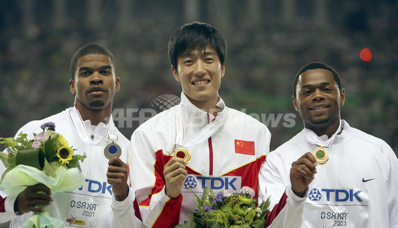 【9月1日 AFP】第11回世界陸上大阪大会(11th IAAF World Championships in Athletics Osaka)、男子110メートルハードル・メダル授与式。中国の劉翔(Liu Xiang)は、12秒95を記録し、金メダルを獲得した。また、2位のテレンス・トラメル(Terrence Trammell、米国)が銀メダル、3位のデービッド・ペイン(David Payne、米国)が銅メダルを獲得した。(c)AFP