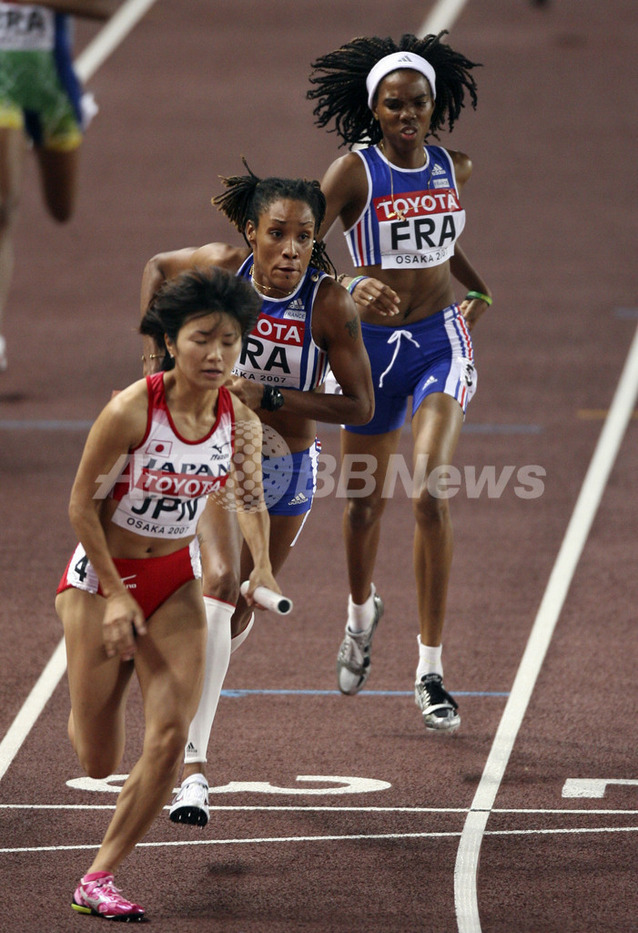 【9月1日 AFP】第11回世界陸上大阪大会(11th IAAF World Championships in Athletics Osaka)、女子4x400メートルリレー・1次予選。日本チーム(青木沙弥佳Sayaka Aoki、丹野麻美Asami Tanno、久保倉里美Satomi Kubokura、木田真有Mayu Kida)は、日本新記録となる3分30秒17を記録するも、2組の6位に終わり、決勝進出を逃した。(c)AFP