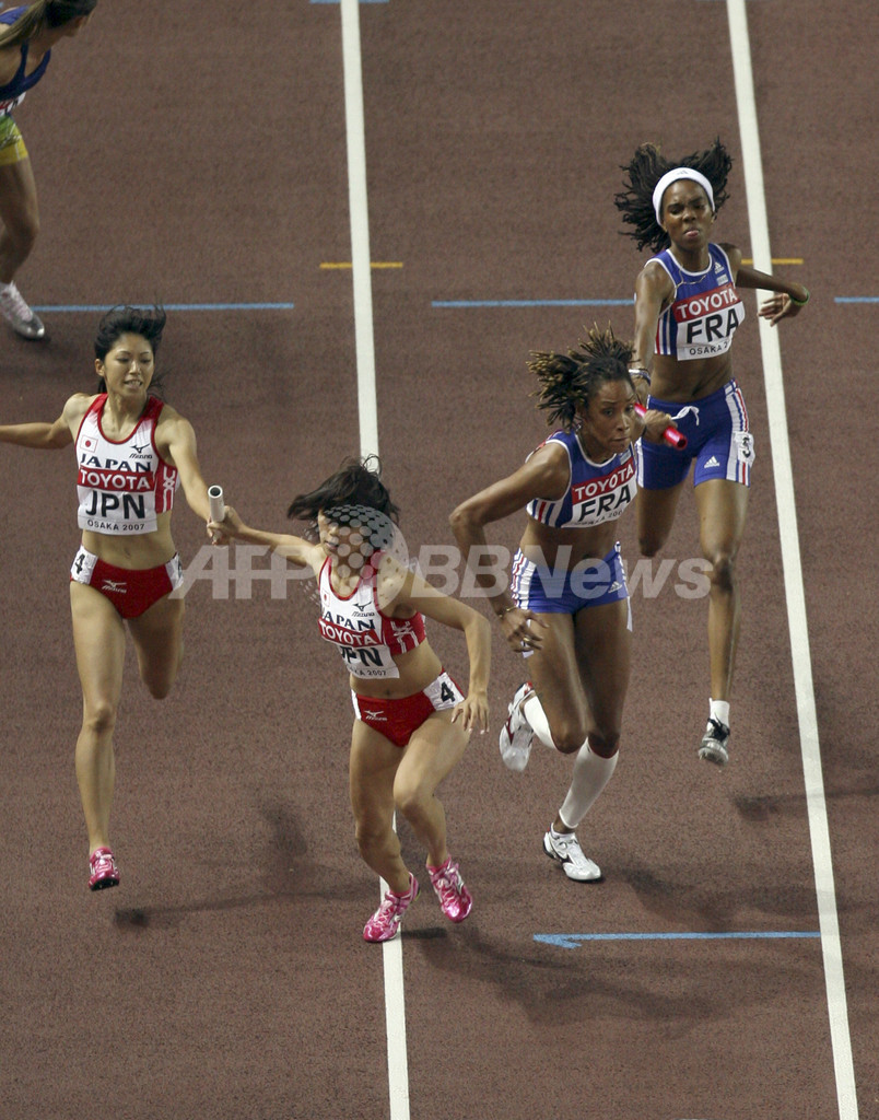 【9月1日 AFP】第11回世界陸上大阪大会(11th IAAF World Championships in Athletics Osaka)、女子4x400メートルリレー・1次予選。日本チーム(青木沙弥佳Sayaka Aoki、丹野麻美Asami Tanno、久保倉里美Satomi Kubokura、木田真有Mayu Kida)は、日本新記録となる3分30秒17を記録するも、2組の6位に終わり、決勝進出を逃した。(c)AFP
