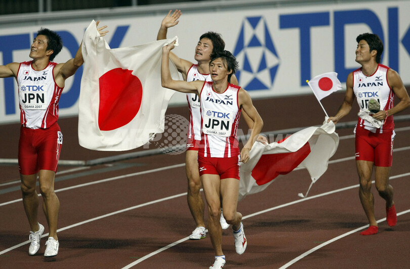 【9月2日 AFP】第11回世界陸上大阪大会(11th IAAF World Championships in Athletics Osaka)、男子4x100リレー・決勝。日本チーム(塚原直貴Naoki Tsukahara、末続慎吾Shingo Suetsugu、高平慎士Shinji Takahira、朝原宣治Nobuharu Asahara)は、日本新記録となる38秒03を記録し、5位入賞を果たした。(c)AFP