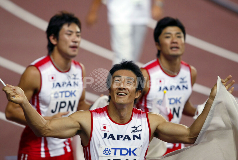 )塚原直貴、朝原宣治、末続慎吾。(c)AFP/FRANCOIS-XAVIER MARIT