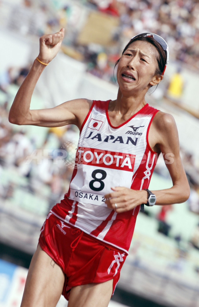 【9月2日 AFP】第11回世界陸上大阪大会(11th IAAF World Championships in Athletics Osaka)、女子マラソン。日本の土佐礼子(Reiko Tosa)は2時間30分55秒を記録し3位入賞を果たし銅メダルを獲得し、開催国の日本に大会初のメダルをもたらした。なお、金メダルは2時間30分37秒を記録したケニアのキャサリン・ヌデレバ(Catherine Ndereba)が、銀メダルは2時間30分45秒を記録した中国の周春秀(Zhou Chunxiu)がそれぞれ獲得した。(c)AFP