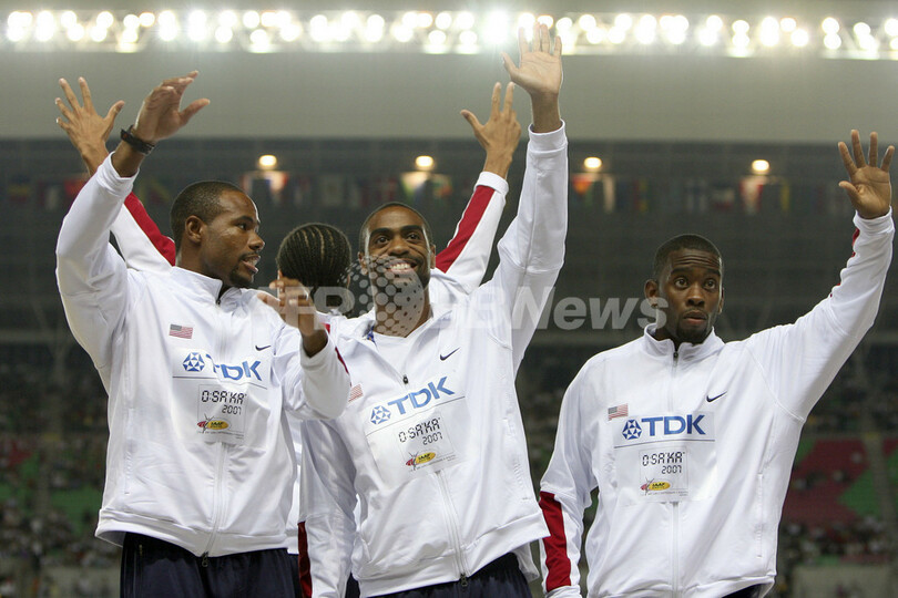 スポーツ スポーツ その他 男子4x100メートルリレーのメダル授与式が行われる 2007年9月2日 20:01 発信地:大阪 [ アジア・オセアニア 大阪 ] このニュースをシェア ‹ › ❮ 6/7 ❯ メダル授与式に臨む米国チームの(左から)ウォレス・スピアーモン(%%Wallace Spearmon%%)、タイソン・ゲイ(%%Tyson Gay%%)、レロイ・ディックソン(%%Leroy Dixon%%)。(c)AFP/GABRIEL BOUYS 画像作成中 ! 【9月2日 AFP】第11回世界陸上大阪大会(11th IAAF World Championships in Athletics Osaka)、男子4x100メートルリレー・メダル授与式。37秒78を記録して優勝を果たした米国チームは、2位に入ったジャマイカチーム、3位に入った英国チームと共にメダル授与式に臨んだ。(c)AFP スポーツ その他 一覧へ> メディア・報道関係・法人の方向け 写真・動画 購入のお問合せ>