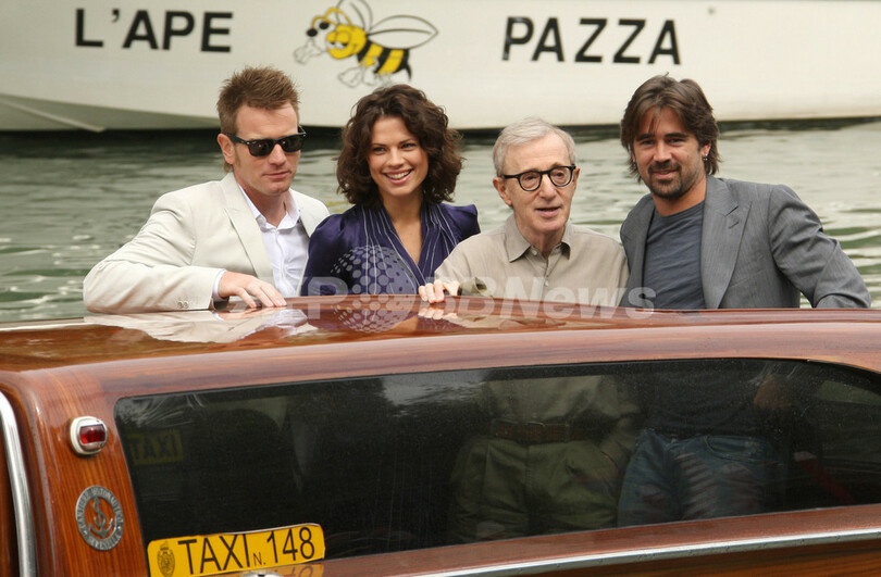 2007年9月2日、第64回ヴェネチア国際映画祭(64th Venice International Film Festival)でコンペティション部門外作品として上映されるウッディ・アレン(Woody Allen)監督の『Cassandra’s Dream』の記者会見に向かう、(左から)英国の俳優ユアン・マクレガー(Ewan McGregor)、英国の女優Hayley Atwell、ウッディ・アレン(Woody Allen)監督とアイルランドの俳優コリン・ファレル(Colin Farrell)。(c)AFP/CHRISTOPHE SIMON