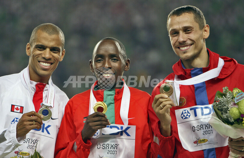 【9月2日 AFP】第11回世界陸上大阪大会(11th IAAF World Championships in Athletics Osaka)、男子800メートル・メダル授与式。1分47秒09を記録して優勝を果たしたケニアのアルフレッド・キーワ・イエゴ(Alfred Kirwa Yego)は、2位に入ったカナダのゲーリー・リード(Gary Reed)、3位に入ったロシアのユーリー・ボルザコフスキー(Yuriy Borzakovskiy)と共にメダル授与式に臨んだ。(c)AFP