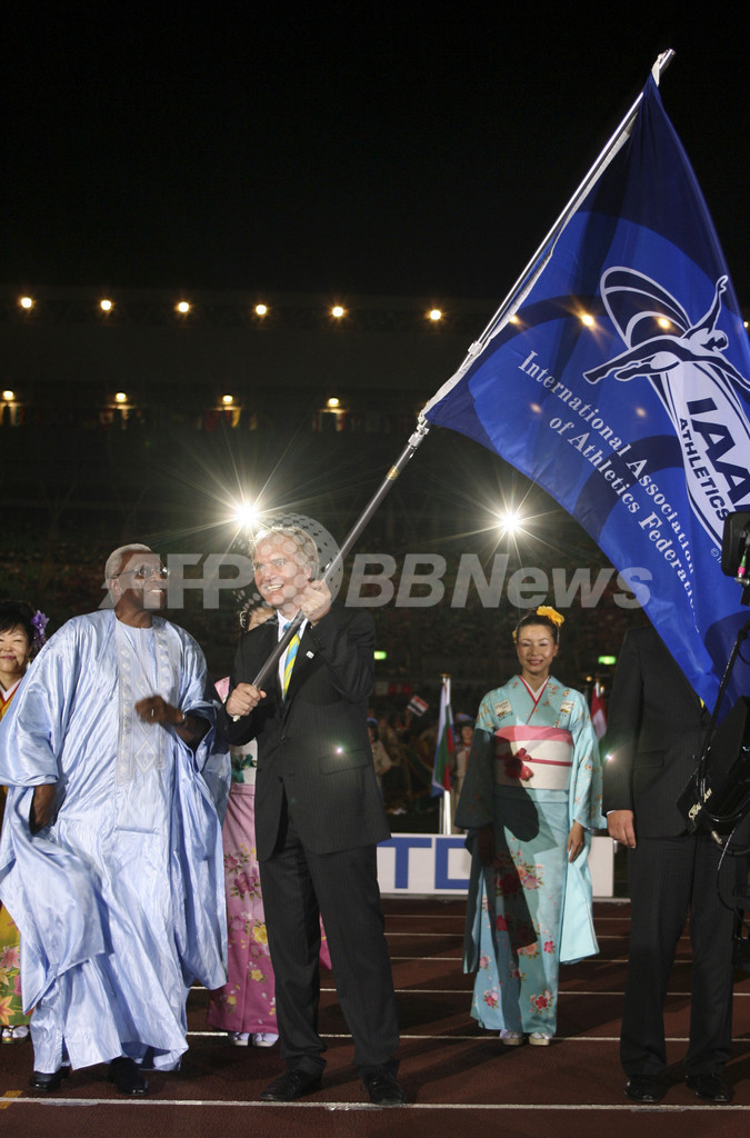 【9月3日 AFP】第11回世界陸上大阪大会(11th IAAF World Championships in Athletics Osaka)の閉会式が開催され、国際陸上競技連盟(International Association of Athletics Federations:IAAF)のラミーネ・ディアック(Lamine Diack)会長から2009年に開催される第12回世界陸上ベルリン大会の大会組織委員会の委員長代行を務めるClemens Prokop氏に大会旗が手渡された。(c)AFP