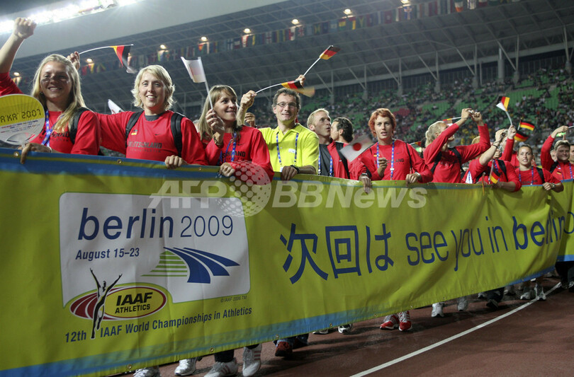 【9月3日 AFP】第11回世界陸上大阪大会(11th IAAF World Championships in Athletics Osaka)の閉会式が開催され、国際陸上競技連盟(International Association of Athletics Federations:IAAF)のラミーネ・ディアック(Lamine Diack)会長から2009年に開催される第12回世界陸上ベルリン大会の大会組織委員会の委員長代行を務めるClemens Prokop氏に大会旗が手渡された。(c)AFP