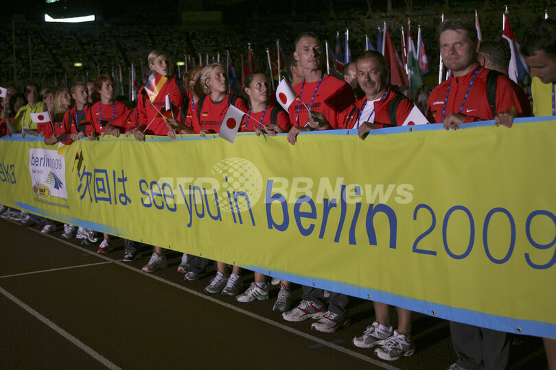 【9月3日 AFP】第11回世界陸上大阪大会(11th IAAF World Championships in Athletics Osaka)の閉会式が開催され、国際陸上競技連盟(International Association of Athletics Federations:IAAF)のラミーネ・ディアック(Lamine Diack)会長から2009年に開催される第12回世界陸上ベルリン大会の大会組織委員会の委員長代行を務めるClemens Prokop氏に大会旗が手渡された。(c)AFP