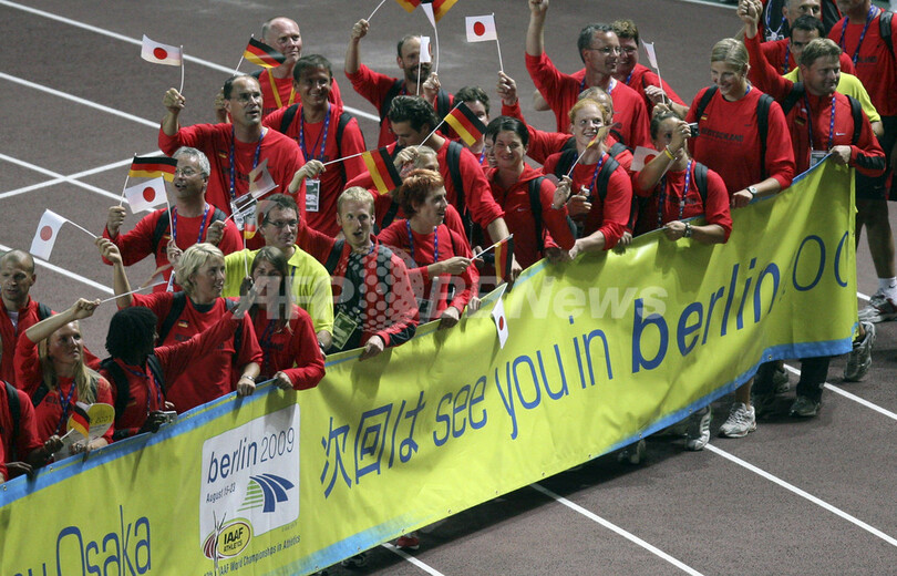 【9月3日 AFP】第11回世界陸上大阪大会(11th IAAF World Championships in Athletics Osaka)の閉会式が開催され、国際陸上競技連盟(International Association of Athletics Federations:IAAF)のラミーネ・ディアック(Lamine Diack)会長から2009年に開催される第12回世界陸上ベルリン大会の大会組織委員会の委員長代行を務めるClemens Prokop氏に大会旗が手渡された。(c)AFP