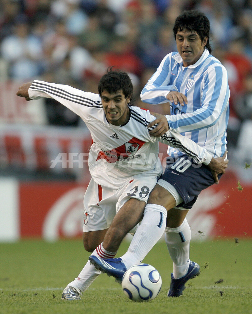 ボールを競るリーベル・プレートのアウグスト・フェルナンデス(%%Augusto Fernandez%%、左)とラシン・クラブのセバスチャン・アリエータ(%%Sebastian Arrieta%%)。(c)AFP/JUAN MABROMATA