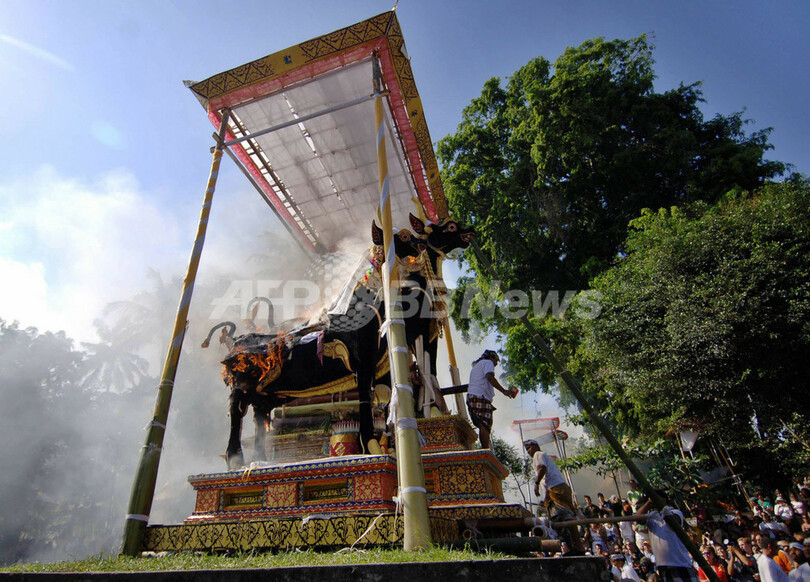 ニュース ライフ バリ島でヒンドゥー教の火葬儀礼「ガベン」が行われる 2007年9月8日 16:00 発信地:ウブド/インドネシア [ アジア・オセアニア インドネシア ] このニュースをシェア ‹ › ❮ 4/4 ❯ 2007年9月7日、バリ島(Bali island)のウブド(Ubud)で、火葬儀礼「ガベン(Ngaben)」で燃やされる、木彫りの動物で飾られたひつぎ。(c)AFP/Sonny TUMBELAKA 画像作成中 ! 【9月8日 AFP】インドネシア・バリ島(Bali island)のウブド(Ubud)で7日、ガベン(Ngaben)と呼ばれるヒンドゥー教の集団火葬儀礼が行われた。同地では、故人の魂は火葬によって解放され、宇宙の元素に還元されると信じられており、またその精神は、より高い次元に引き上げられると考えられている。(c)AFP ライフ 一覧へ> メディア・報道関係・法人の方向け 写真・動画 購入のお問合せ>