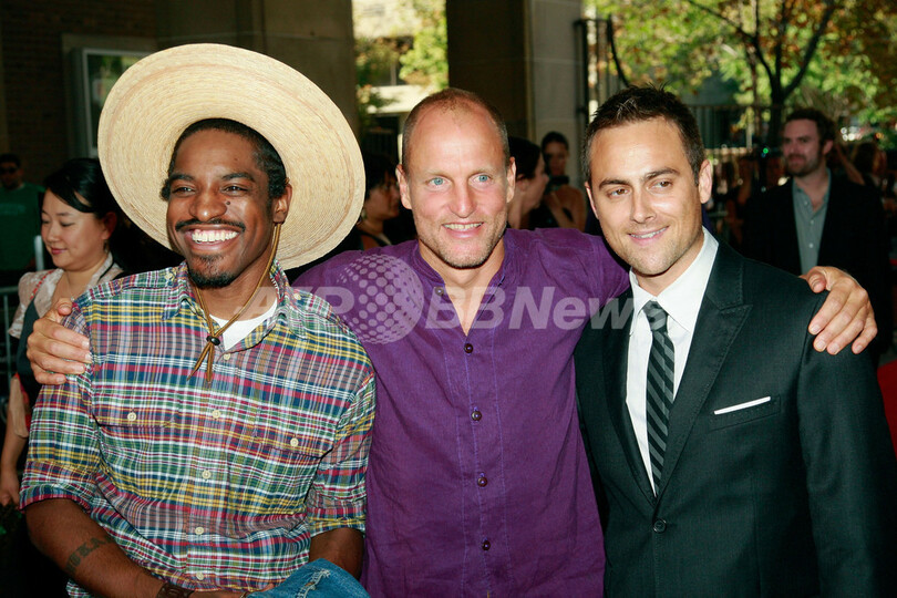 2007年9月8日、第32回トロント国際映画祭(32nd Toronto International Film Festival)で、映画『Battle in Seattle』のワールドプレミア上映会に到着した(左から)俳優/ミュージシャンのアンドレ・ベンジャミン(%%Andre Benjamin%%)、俳優のウディ・ハレルソン(%%Woody Harrelson%%)、俳優のスチュアート・タウンゼント(%%Stuart Townsend%%)。(c)AFP/Getty Images Evan Agostini